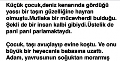 Küçük çocuk,deniz kenarında gördüğü yassı bir taşın güzelliğine hayran olmuştu.Mutlaka bir mücevherdi bulduğu. Şekli de... -